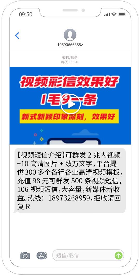 2、視頻短信三網覆蓋,5秒必達,手機適配度可達99.99%,2MB大小內容相當于30秒高清視頻,5張高清圖片或者幾十萬文字小說。信息保存于短信收件箱內,可隨時反復查看,增強營銷效果。